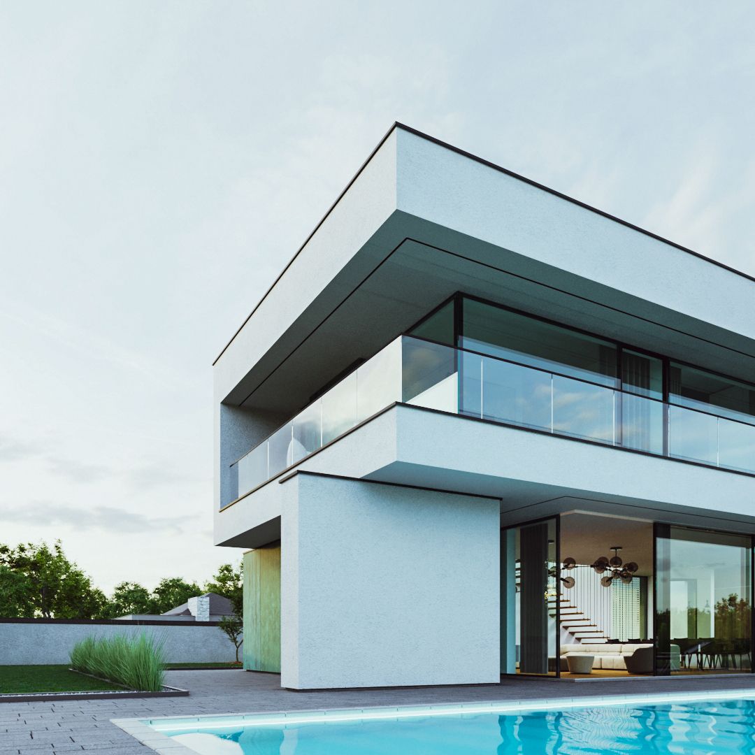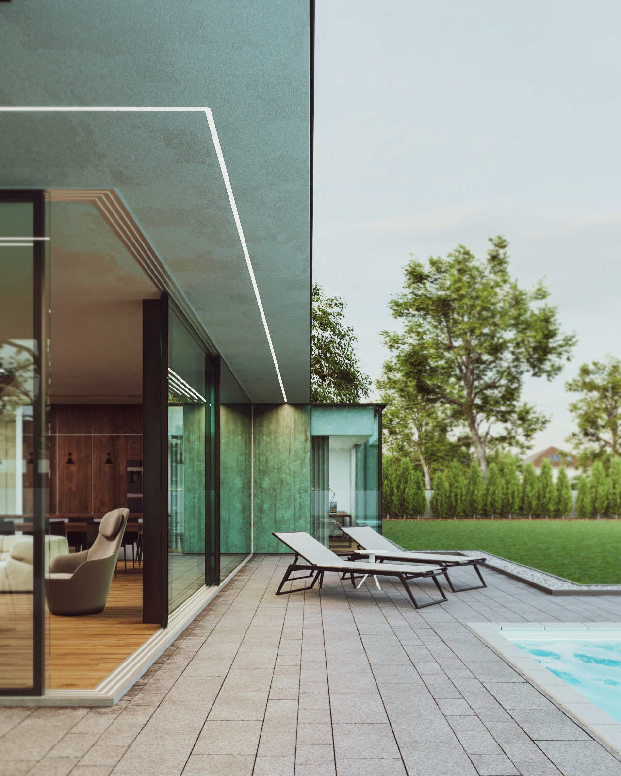 The house consists of several blocks composed in such a way as to separate the day zone from the night zone. On the ground floor, patina metal sheets were used on the facades, characterized by a turquoise shade with numerous abrasions. The living room, kitchen and private office have a direct view of the large garden space. The night zone, located on the first floor, has a 360-degree view of the plot thanks to high glazing stretching almost the entire width of the façade.