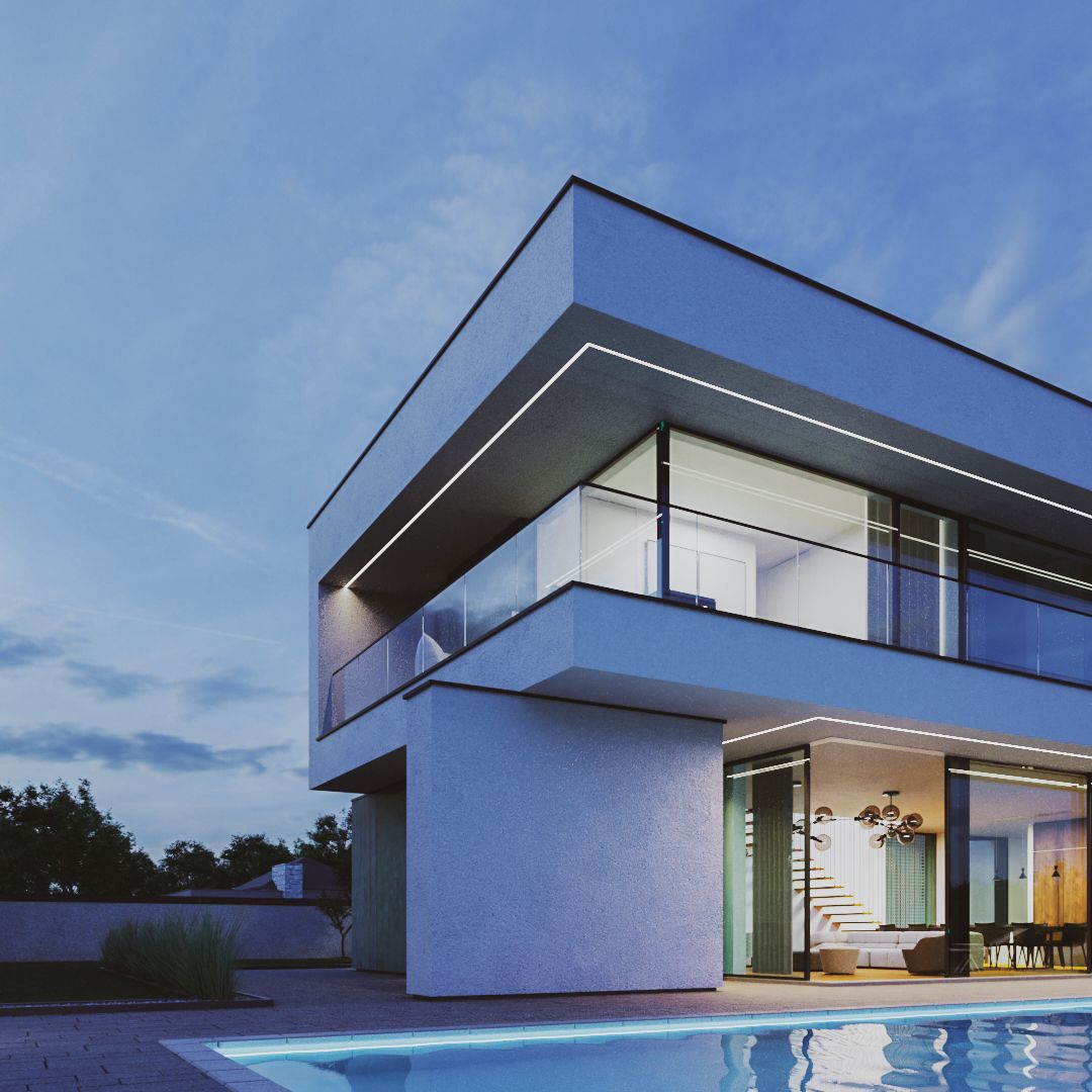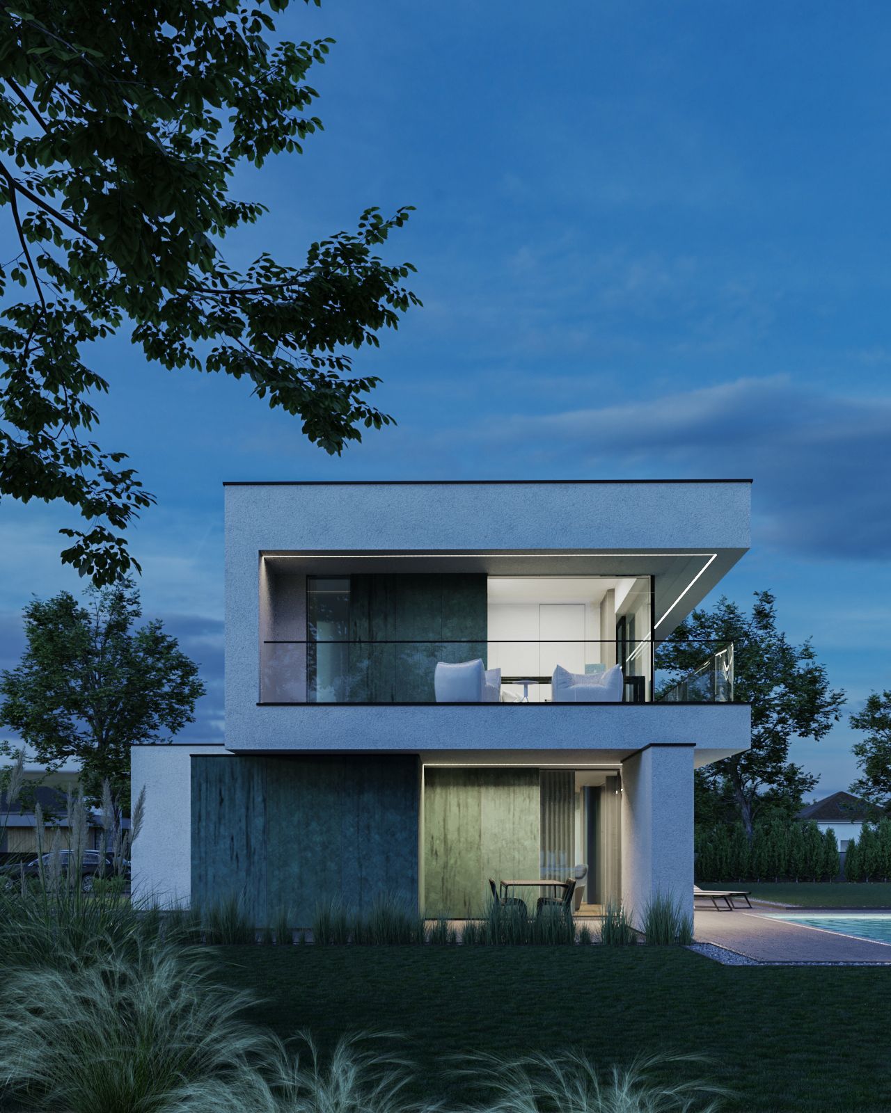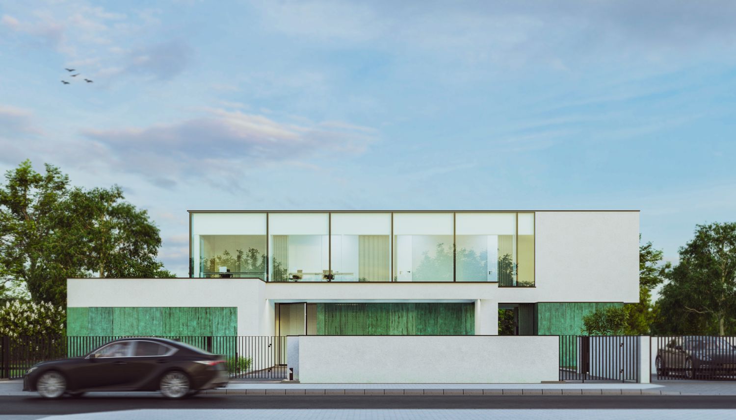 Dom składa się z kilku brył skomponowanych w taki sposób, aby oddzielać strefę dzienną od strefy nocnej. W parterze na elewacjach zastosowano patynę, charakteryzująca się turkusowym odcieniem z licznymi przetarciami. Salon, kuchnia oraz biuro ma bezpośredni widok na dużą przestrzeń ogrodu. Zlokalizowana na piętrze strefa nocna, dzięki wysokim przeszkleniom rozciągniętym na prawie całą szerokość elewacji, ma widok 360 stopni na działkę.