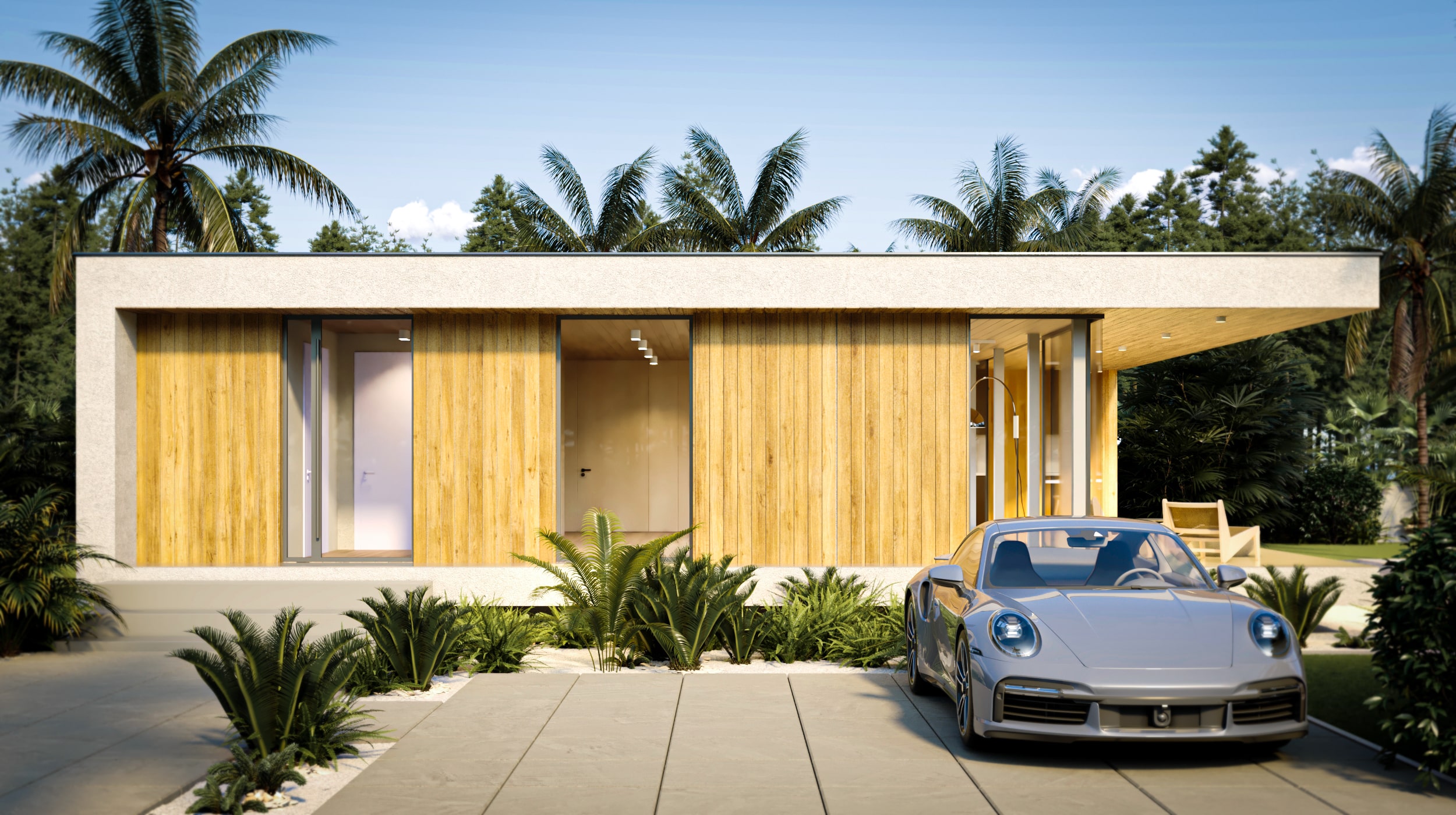 Projektowany dom jednorodzinny ukształtowano jako parterowy budynek o zwartej, nowoczesnej formie przekrytej płaskim dachem. Elewacje wykończono białymi płytami elewacyjnymi oraz drewnem, które podkreślają prostą i elegancką kompozycję. Niezależny, jednokondygnacyjny garaż o białej, tynkowanej elewacji uzupełnia zabudowę jako wolnostojący obiekt.