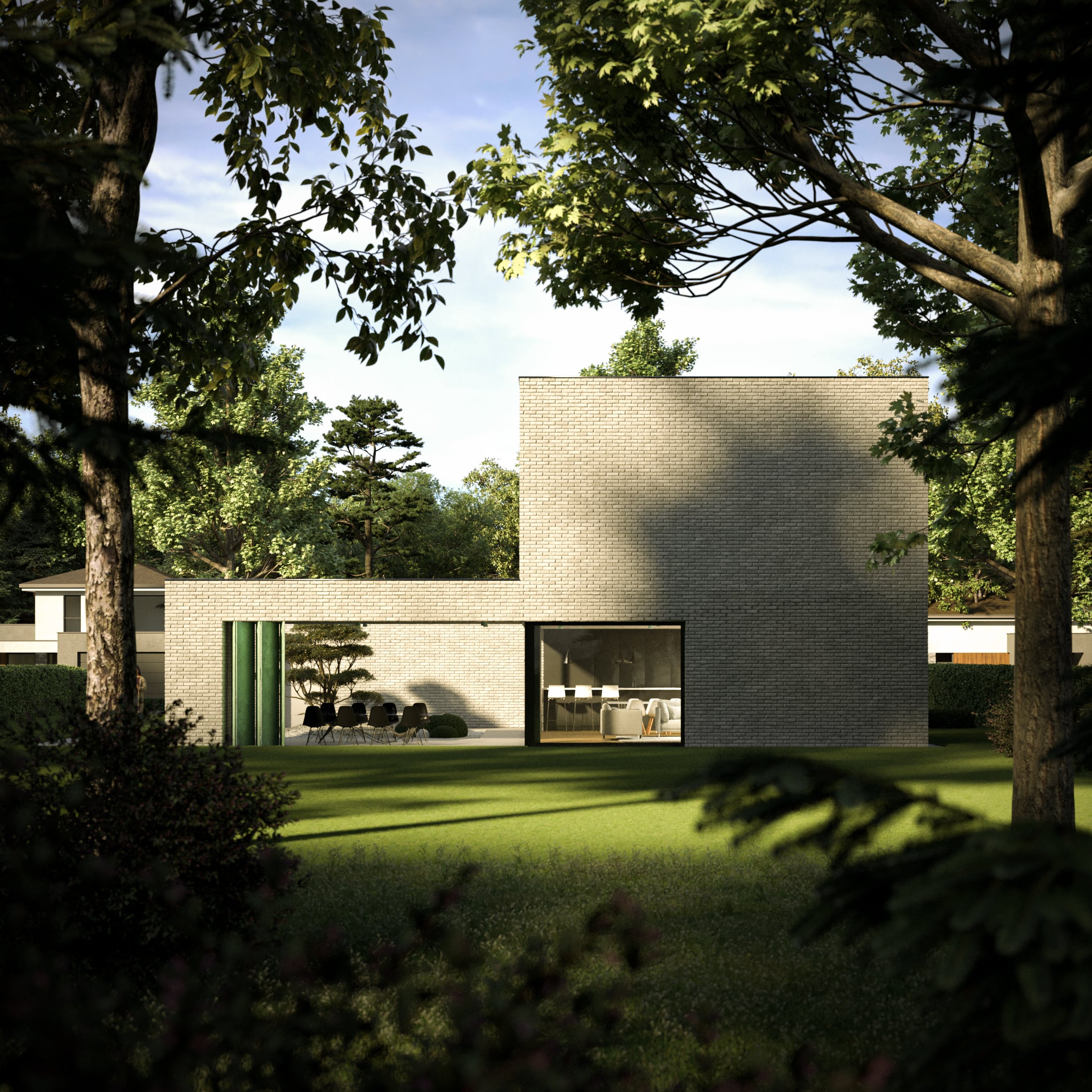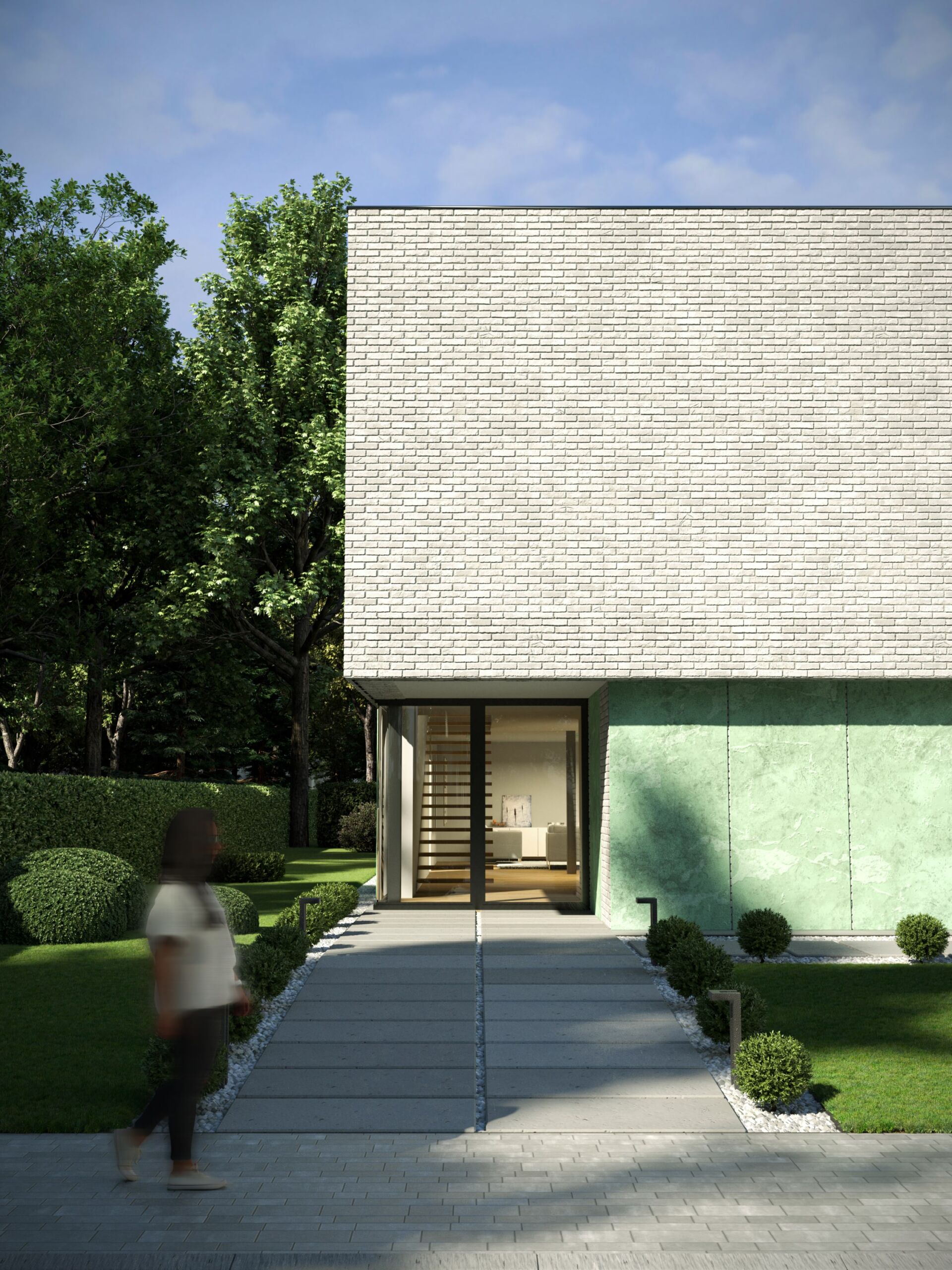 Dom otrzymał prostą formę architektoniczną, a dzięki dużym przeszkleniom światło wpada do środka na przestrzał. Całość bryły została spięta profilami elewacyjnymi oraz kompozycją ścian zewnętrznych, lekko wysuniętych względem płaszczyzn dachu i elewacji.