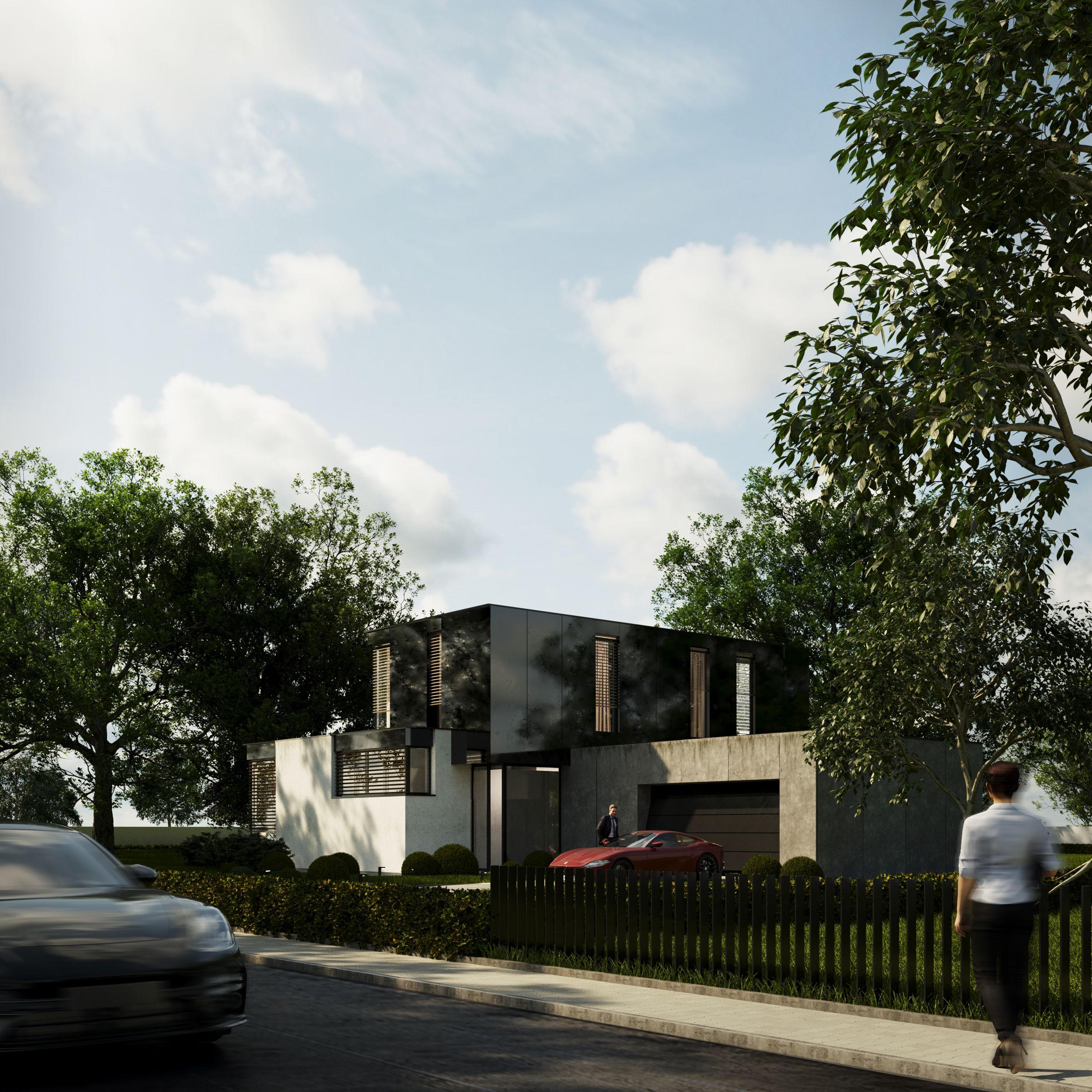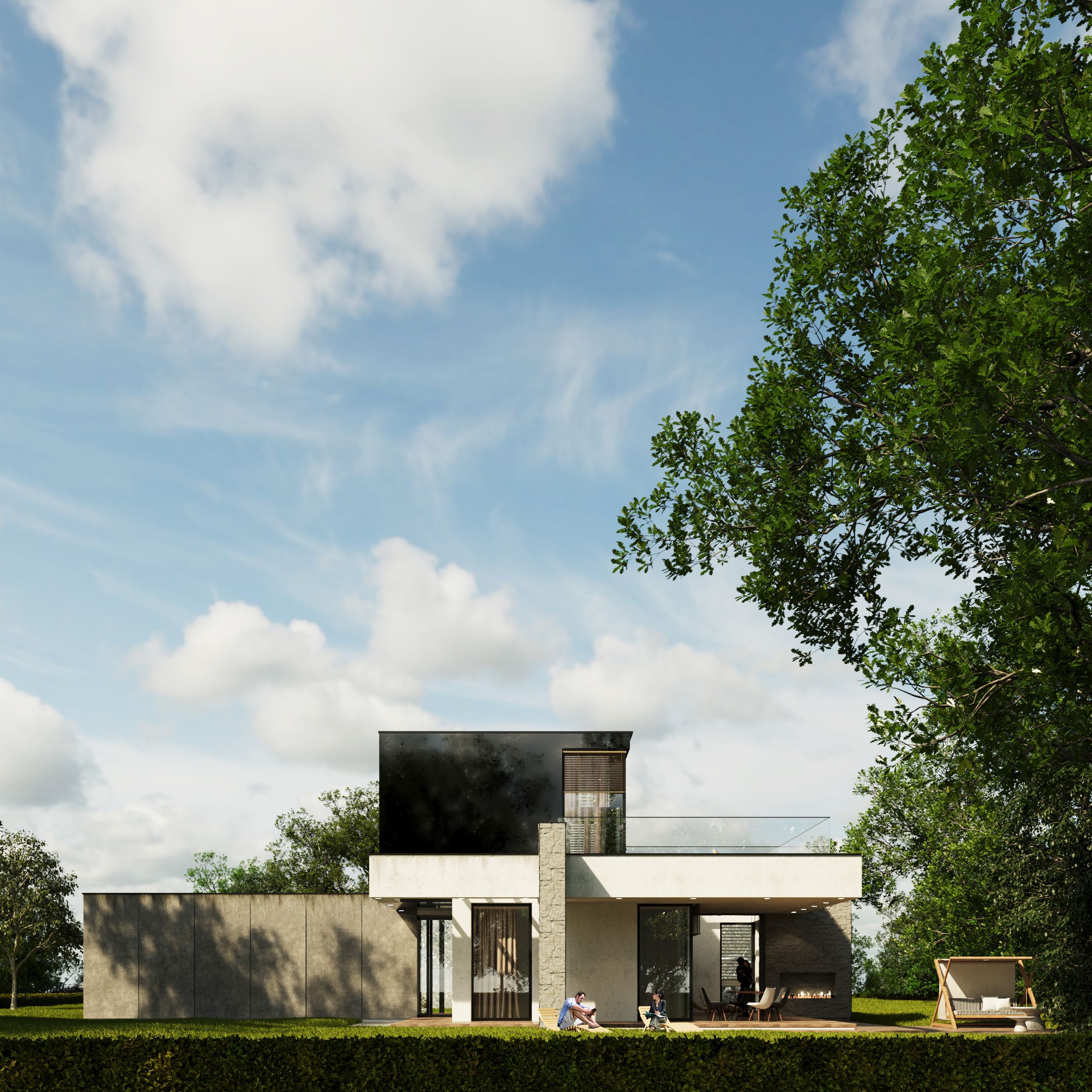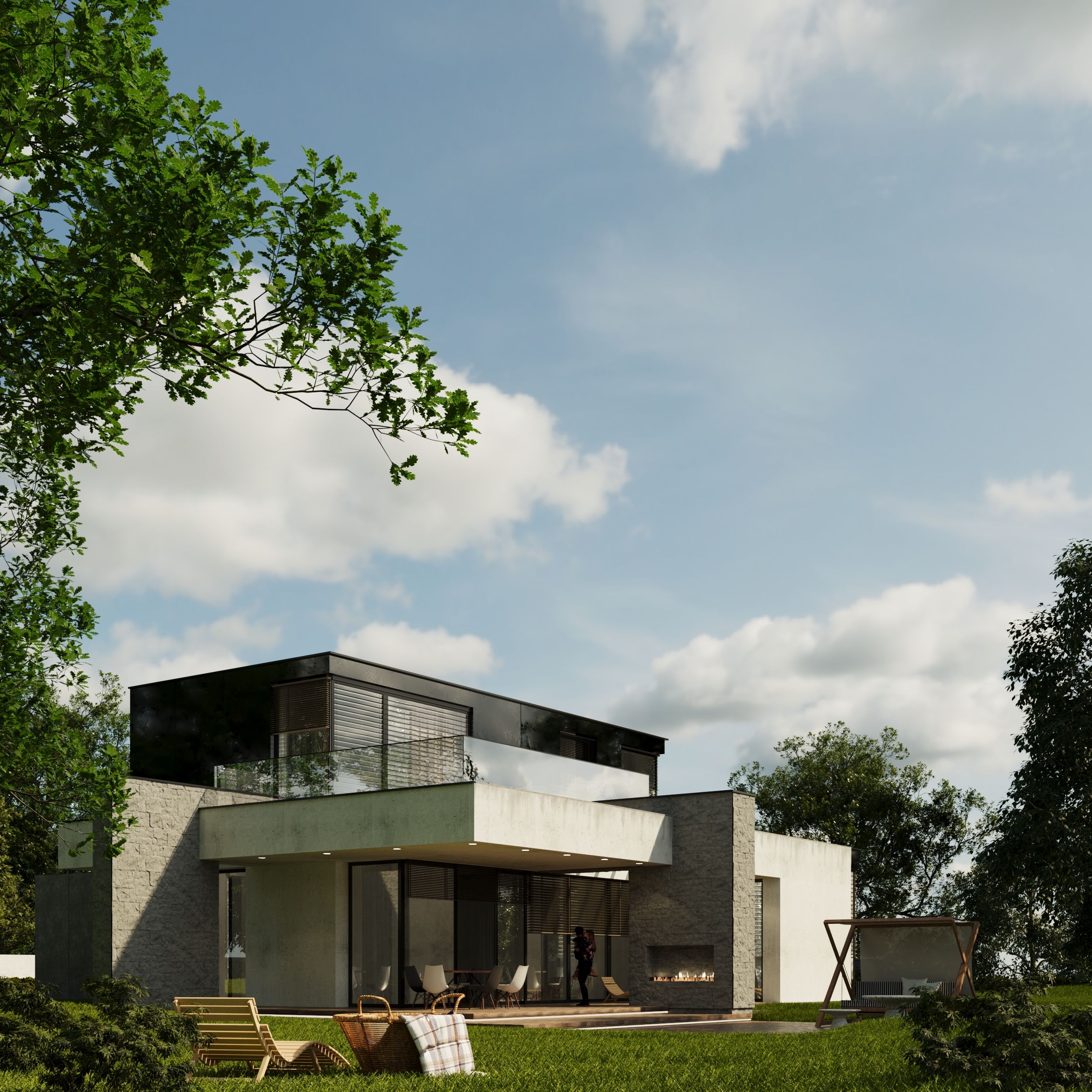 Budynek mieszkalny zaplanowano na planie kilku zestawionych prostokątów, z wyższą, dwukondygnacyjną bryłą oraz otaczającą ją jednokondygnacyjną częścią z płaskim dachem i nadwieszonym tarasem.