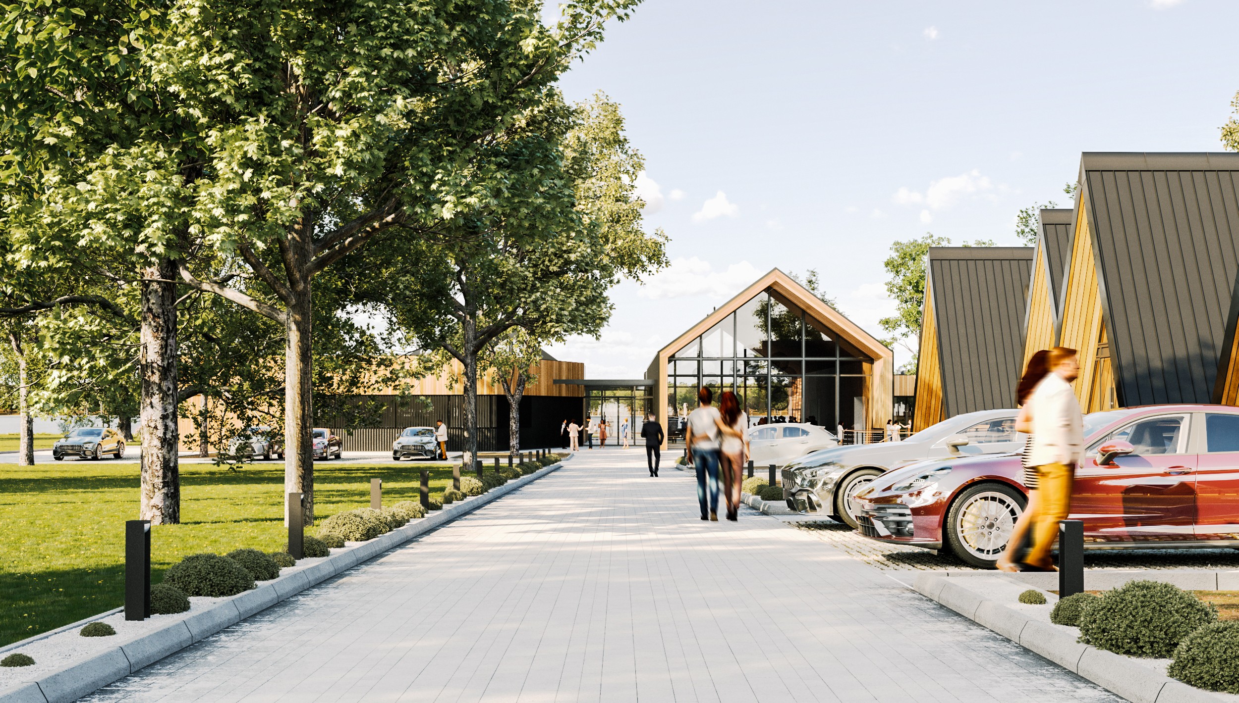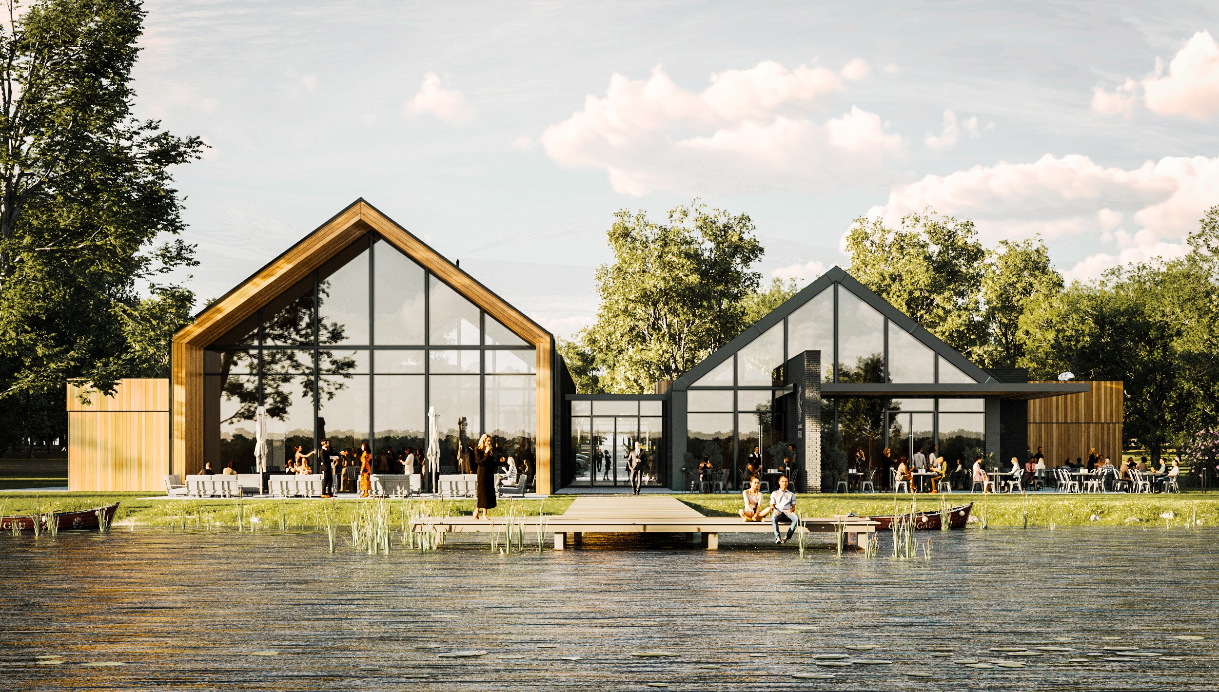 Kompleks restauracyjny z salą do organizowania większych uroczystości wraz z nowoczesnymi brdami mieszkalnymi, został położony w pobliżu jeziora, w otoczeniu gęstej zieleni. Założenie ma tworzyć spójną całość urbanistyczną, która daje możliwość odpoczynku w naturze. Bryły budynków zostały połączone wysokimi przeszkleniami z komunikacją i obłożone drewnem, szarą cegłą oraz panelami stalowymi. Funkcjonalność kompleksu rozszerzono o liczne tarasy zewnętrzne, zorganizowaną zieleń i miejsca odpoczynku.