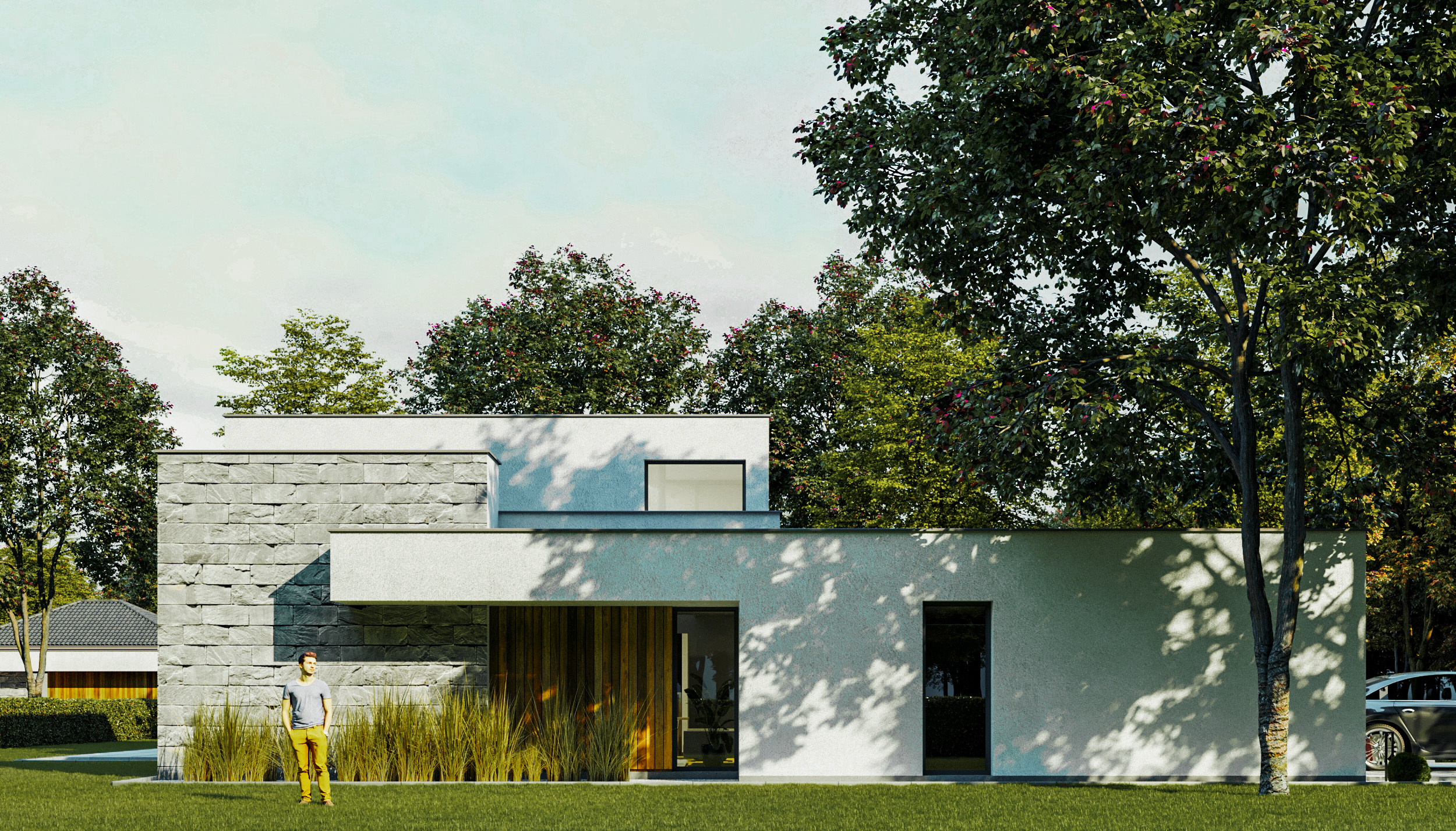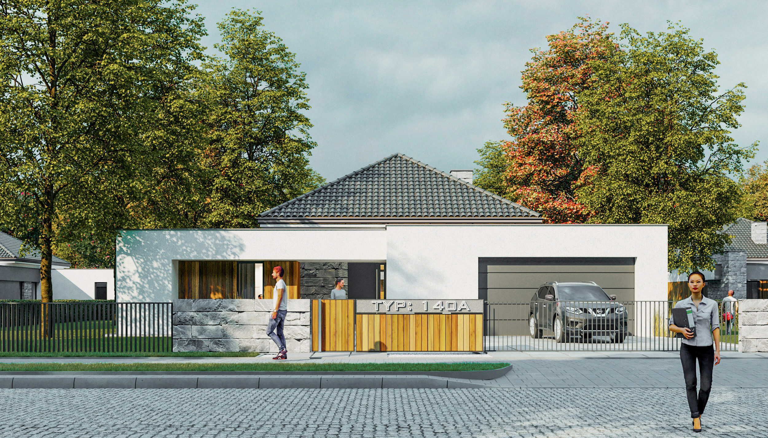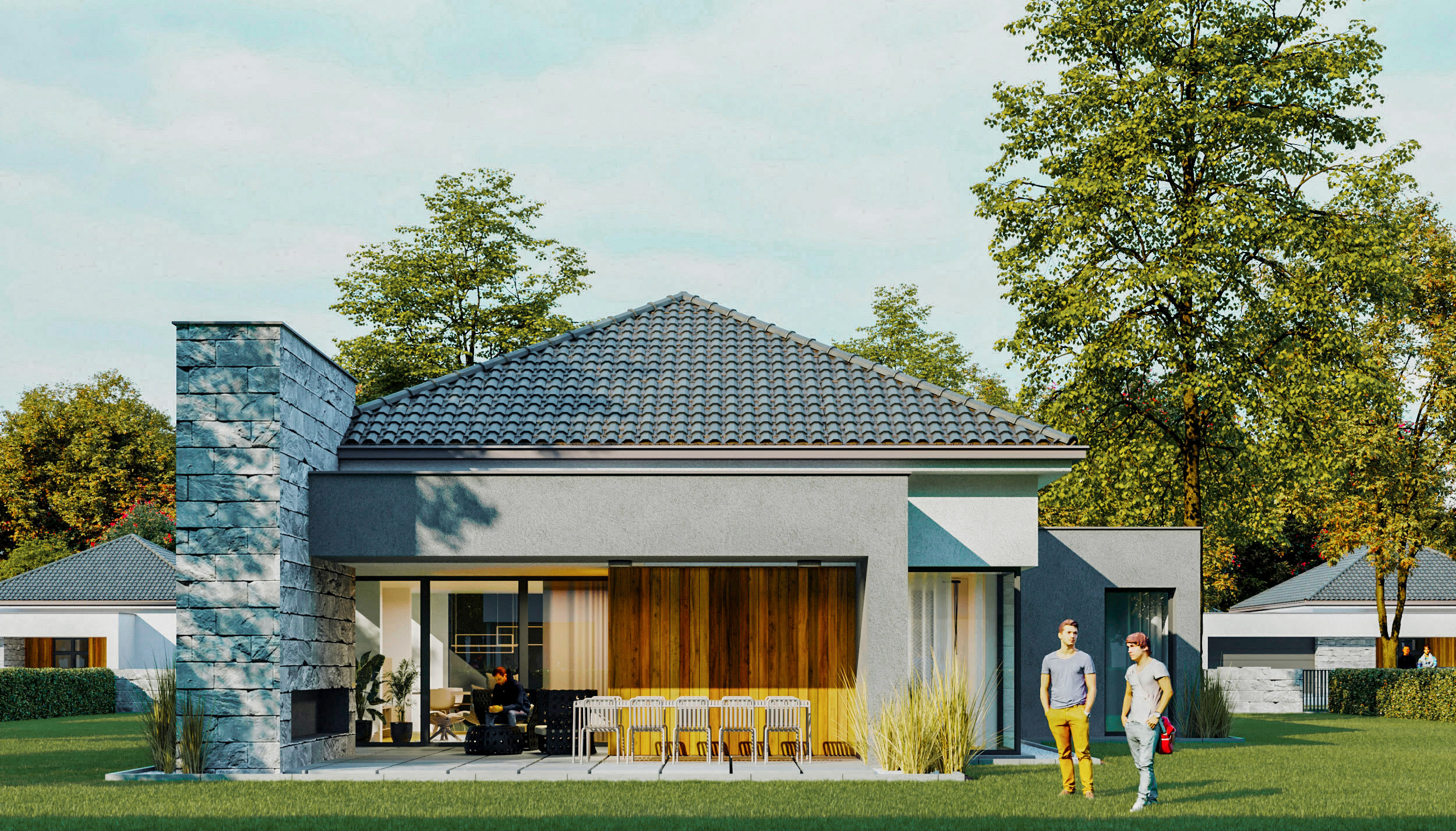 Opis projektu: Projekt osiedla składa się z kompozycji kilkunastu domów-wzorów o różnych powierzchniach od 140 do 215 metrów kwadratowych. W projekcie elewacji zastosowano płyty hpl imitujące drewno oraz kamień łupkowy na bryłach kominków zewnętrznych. Domy wyróżniają się licznymi podcieniami, zadaszeniami oraz wysokimi na całą kondygnację oknami.
