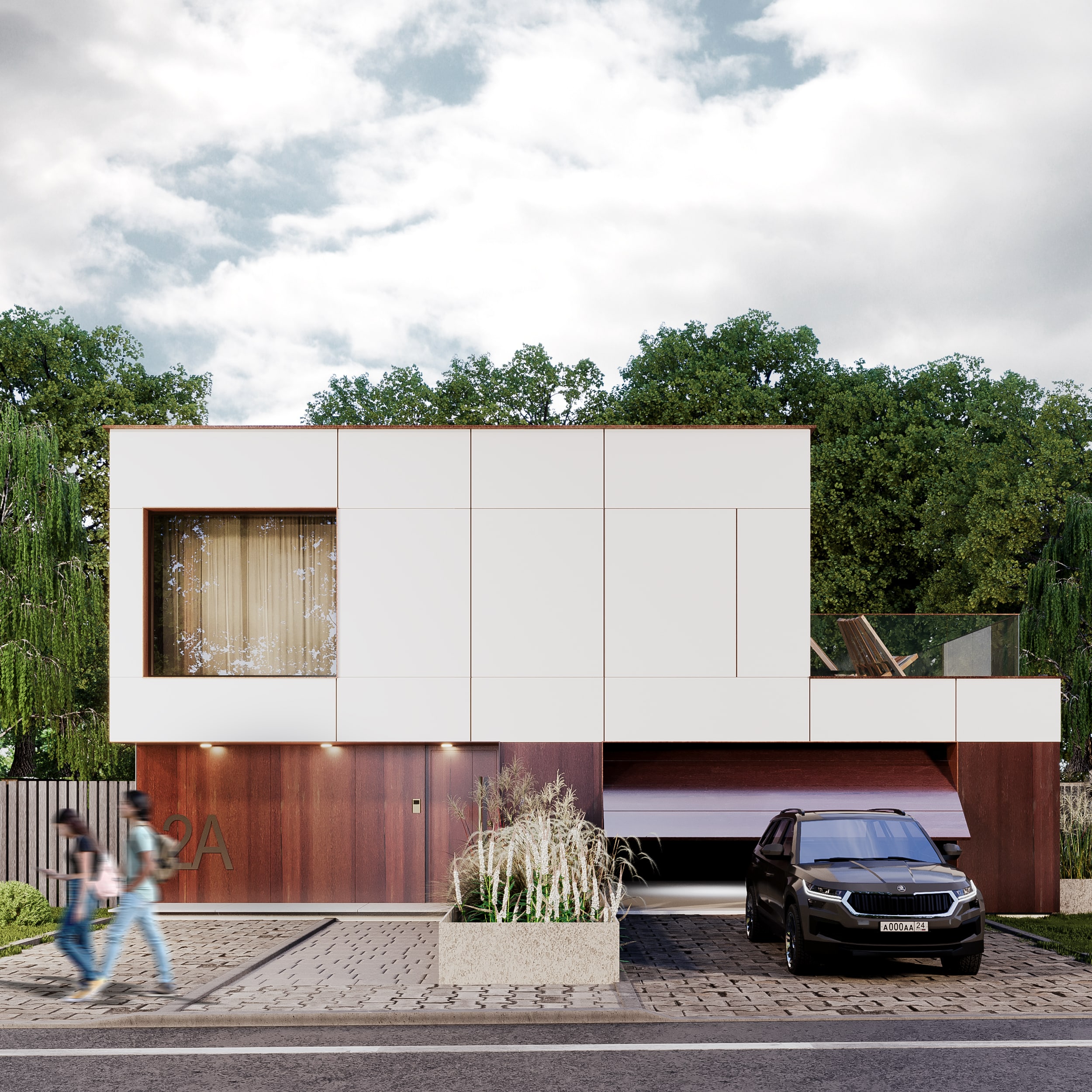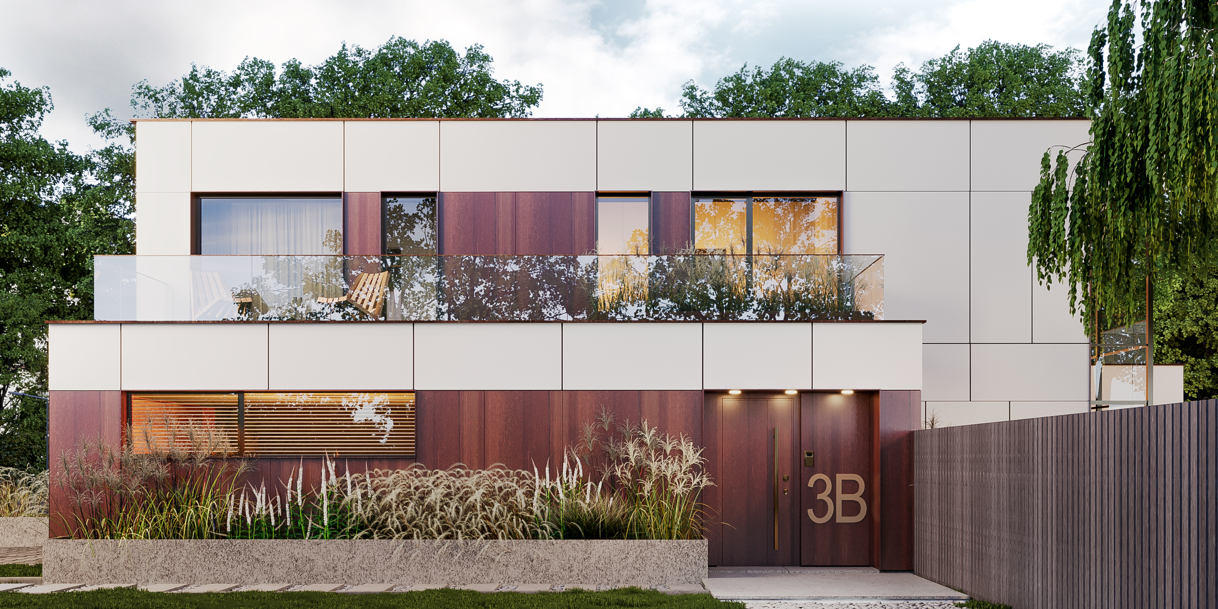 Kompleks składa się z 3 domów, wyróżniających się cortenowymi elementami w elewacji, wszystko w otoczeniu wysokiej zieleni. Ich bryły są proste, nawiązujące do modernistycznych kostek. Okna w domach uzyskały pełne wysokości kondygnacji, dzięki czemu wnętrza są rozświetlone i w stałym kontakcie z zewnętrzem.
