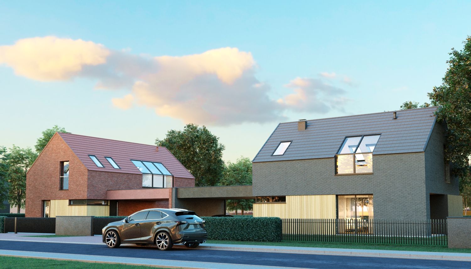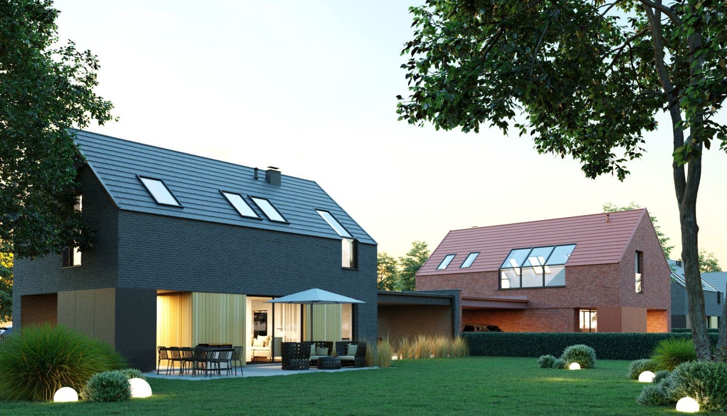Projekt domów wpisany został w kompozycję urbanistyczną, złożoną z par budynków jednorodzinnych, połączonych wiatami garażowymi. Budynki naprzemiennie zostały zlokalizowane równolegle oraz prostopadle do ulicy, tworząc charakterystyczną i zróżnicowaną linię zabudowy. Dzięki takiemu rozwiązaniu, uniknięto monotonnej i jednolitej zabudowy ulicy osiedla, dodatkowo podkreślając każdy budynek elewacją ceglaną w różnych kolorach.