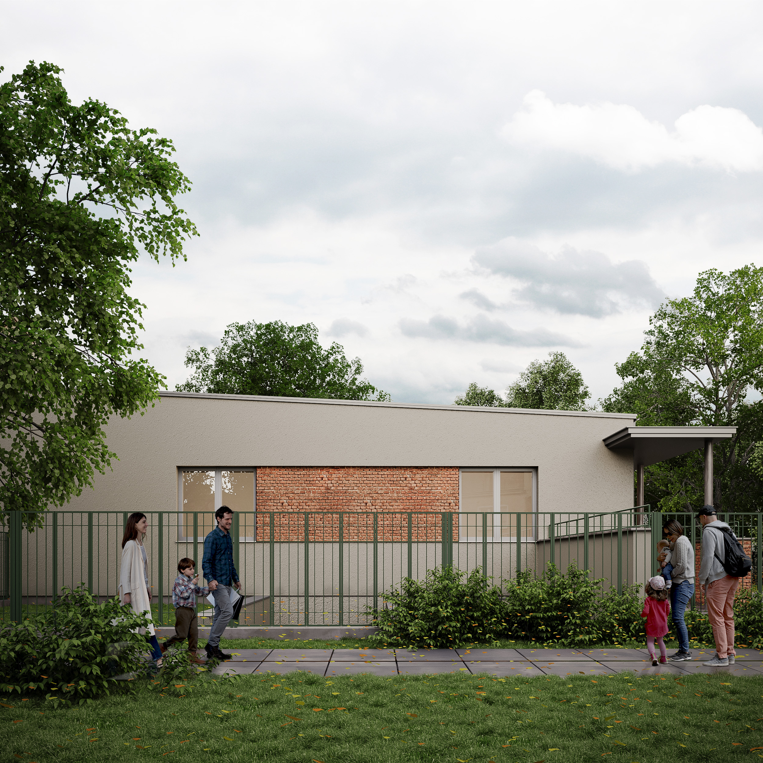 Przedszkole znajduje się na terenie modernistycznego osiedla Montwiłła- Mireckiego. Jego przebudowa polegała na dostosowaniu obiektu do potrzeb edukacji przedszkolnej oraz dla jego zaplecza. Całość bryły została oczyszczona naleciałości po poprzedniej przemysłowej funkcji budynku. W projekcie podkreślono strefę wejściową zadaszeniem na lekkich słupach nawiązującym do wczesnego modernizmu.