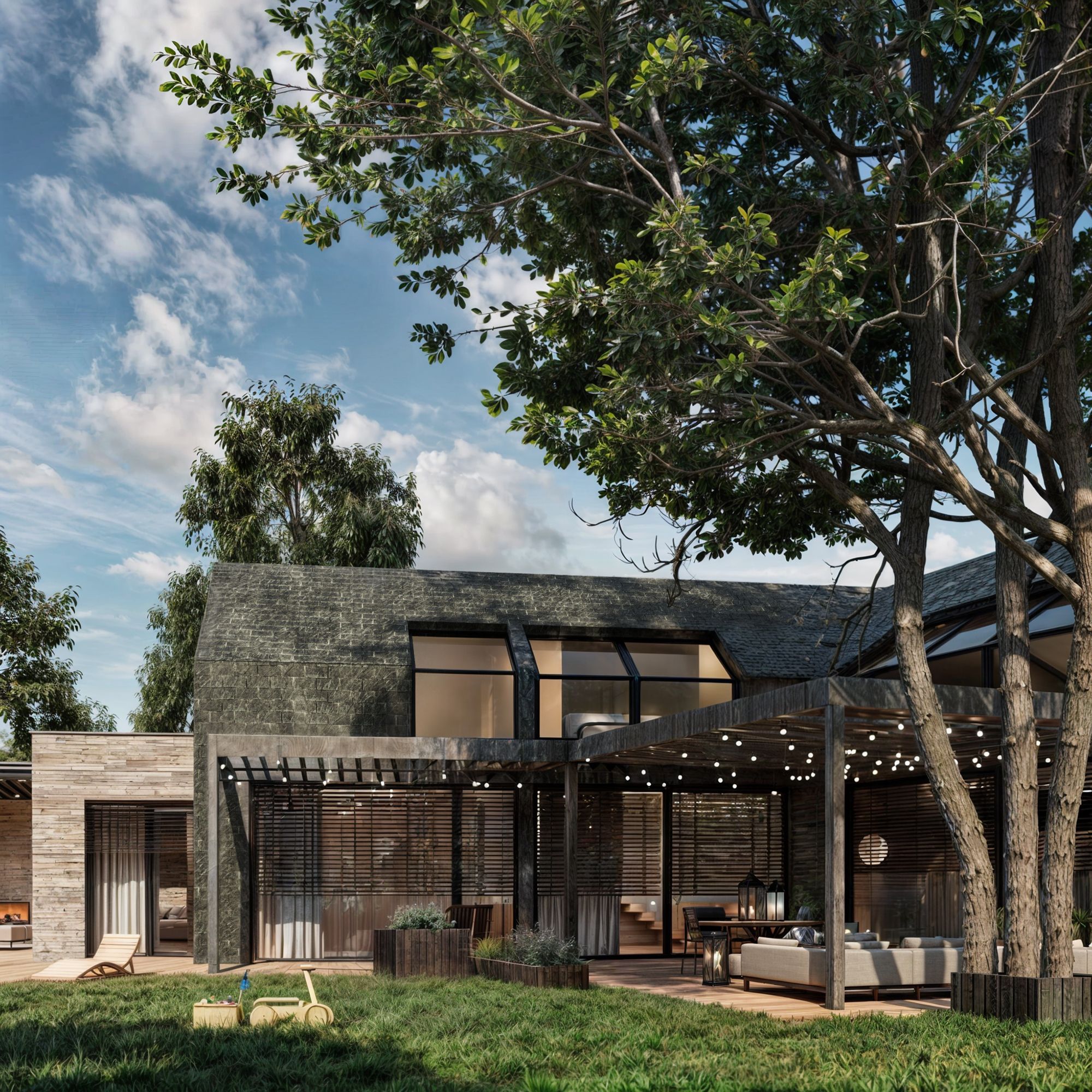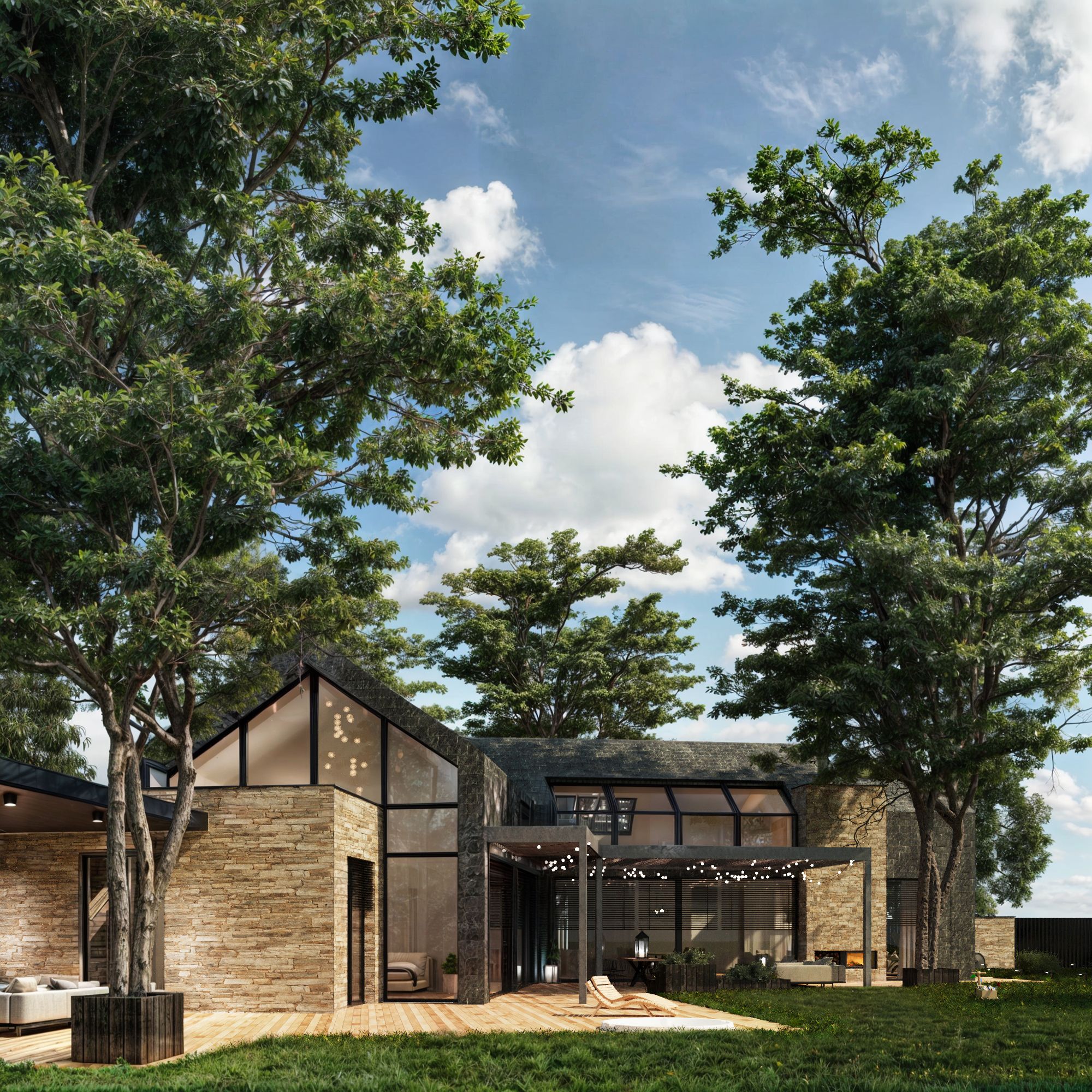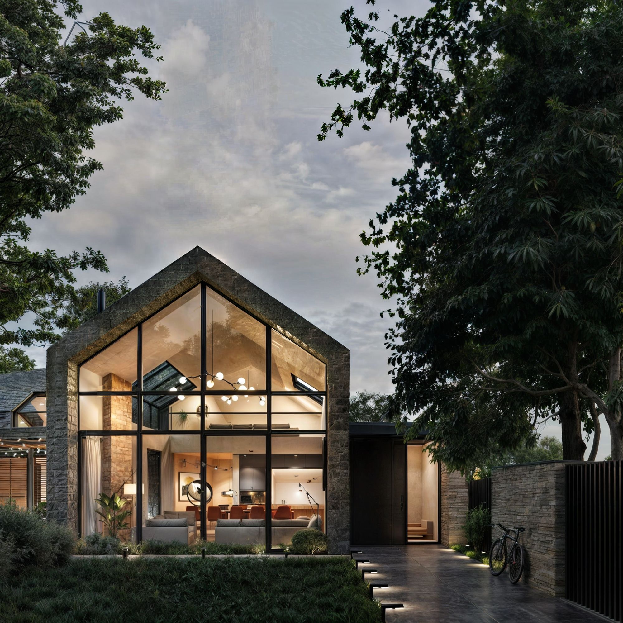 Budynek mieszkalny ma trzy kondygnacje użytkowe – dwie naziemne. Tworzy go dwukondygnacyjna bryła z dachem dwuspadowym i jednokondygnacyjna część z płaskim dachem. Wielkoformatowe przeszklenia i elewacje z łupku i kamienia podkreślają nowoczesny charakter budynku.