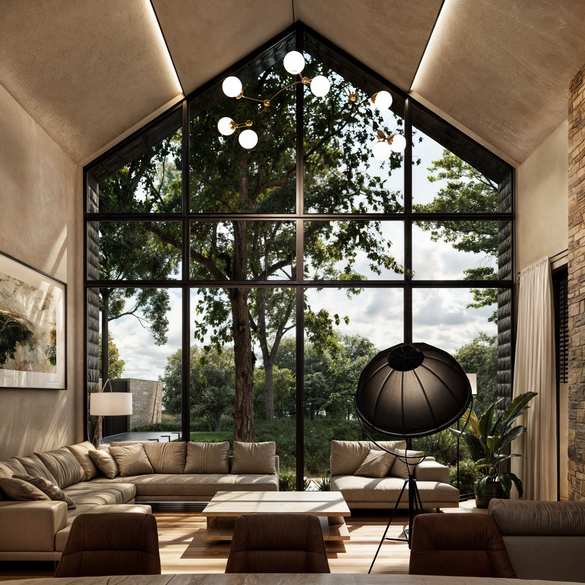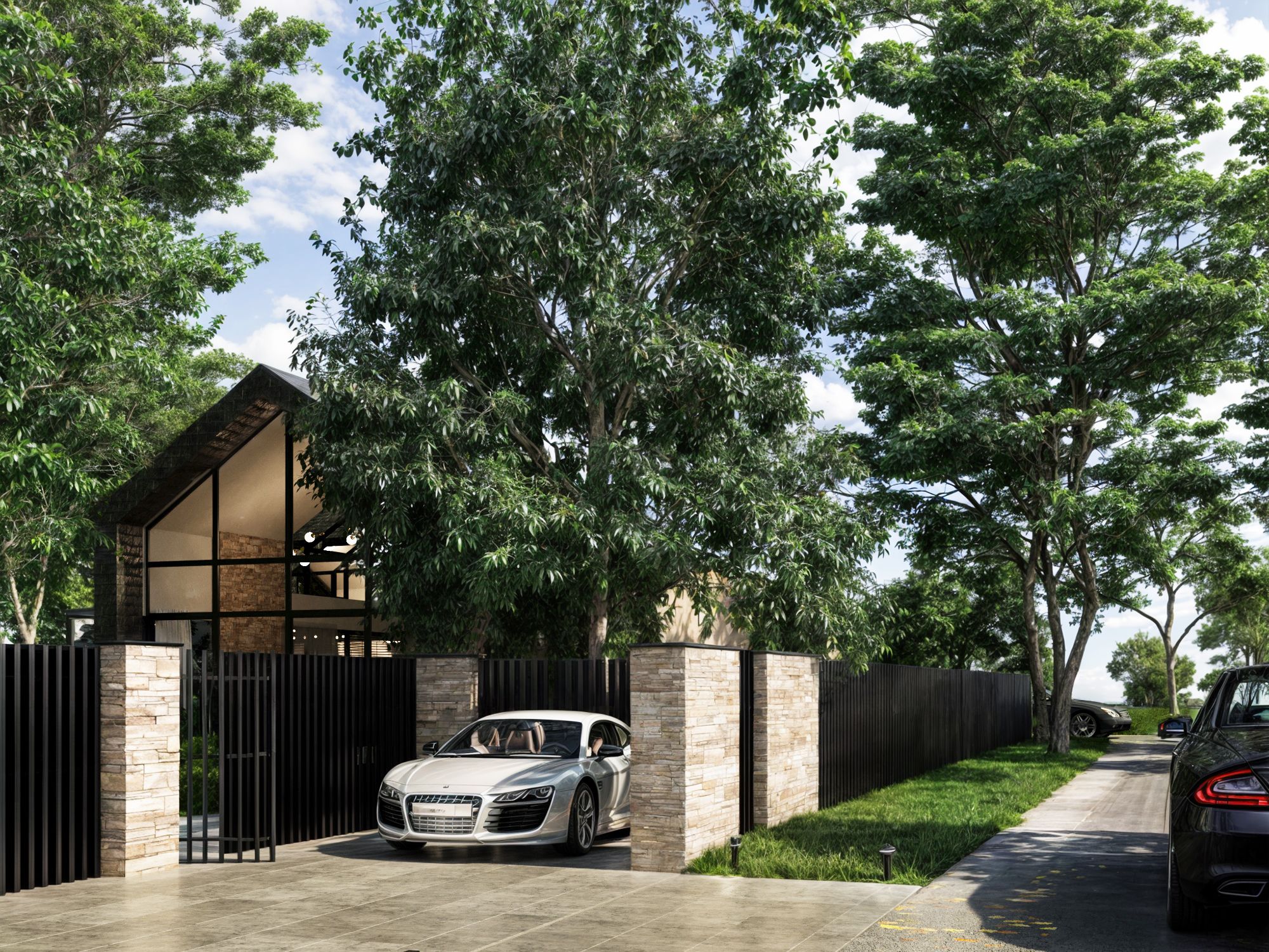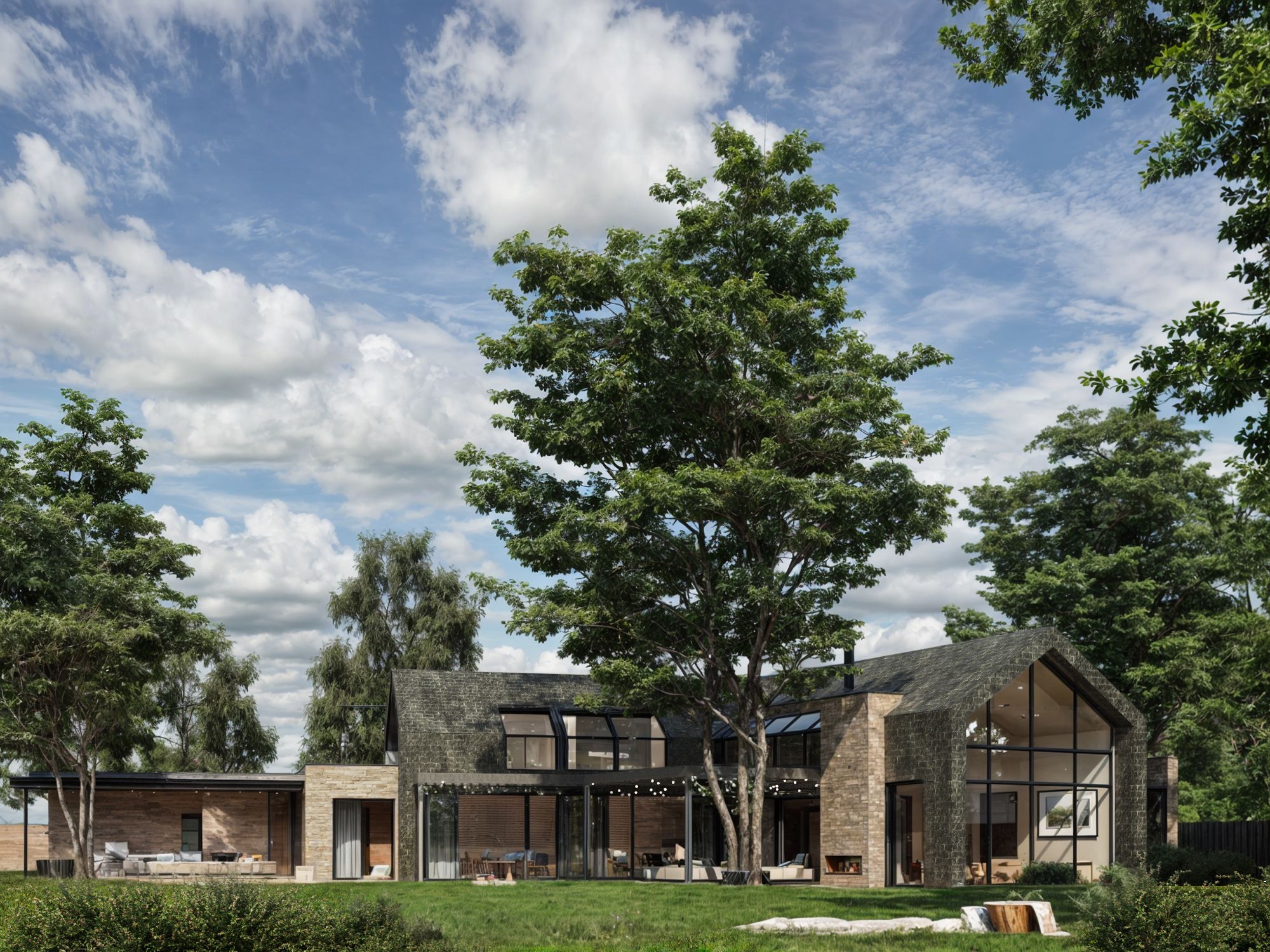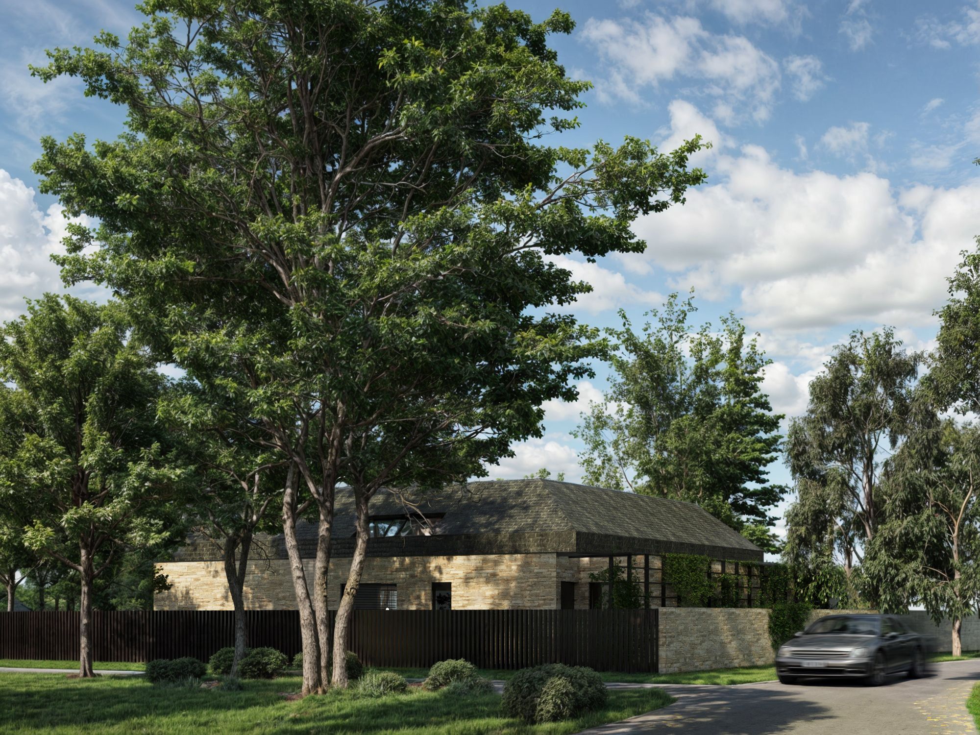 Budynek mieszkalny ma trzy kondygnacje użytkowe – dwie naziemne. Tworzy go dwukondygnacyjna bryła z dachem dwuspadowym i jednokondygnacyjna część z płaskim dachem. Wielkoformatowe przeszklenia i elewacje z łupku i kamienia podkreślają nowoczesny charakter budynku.