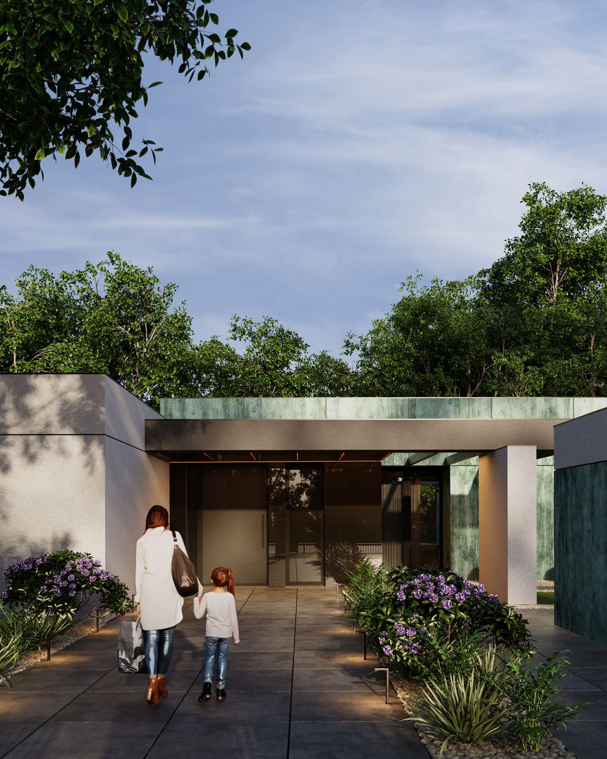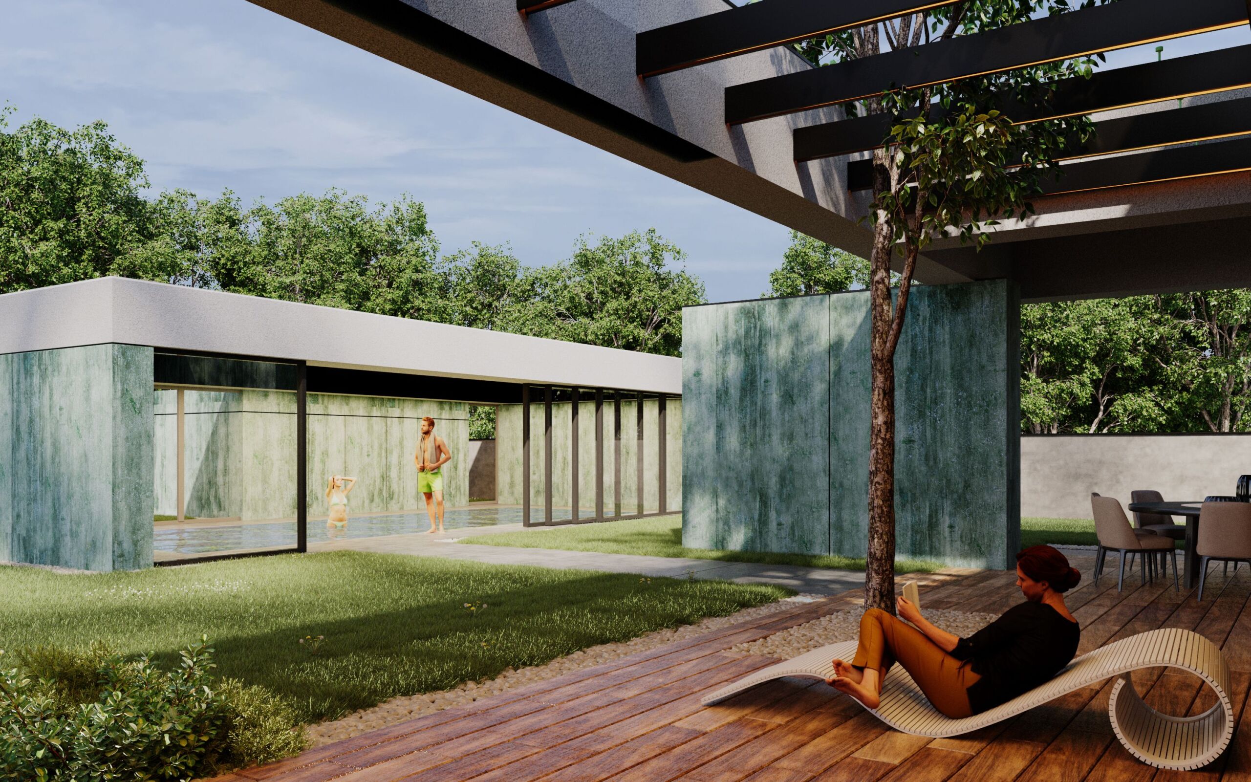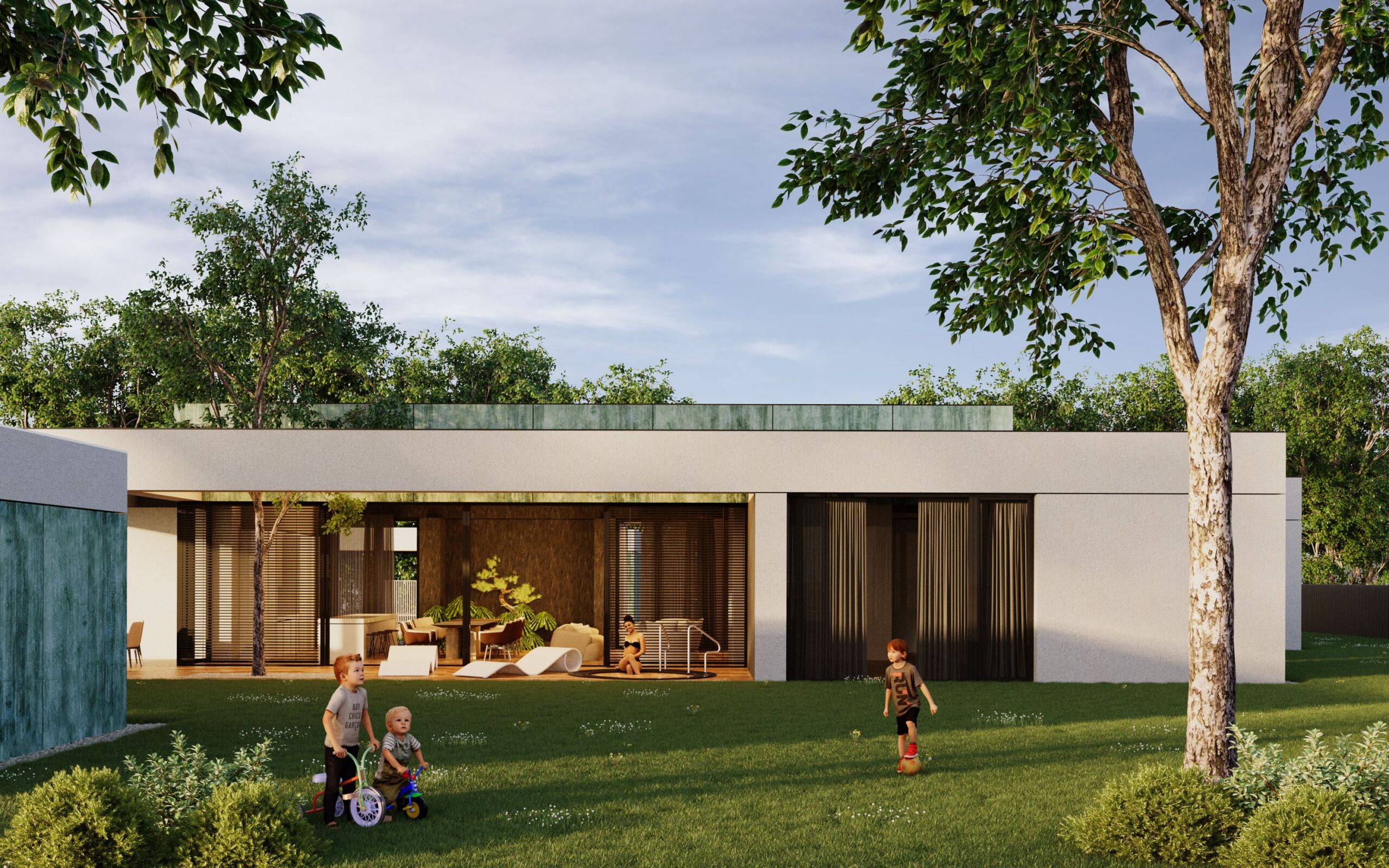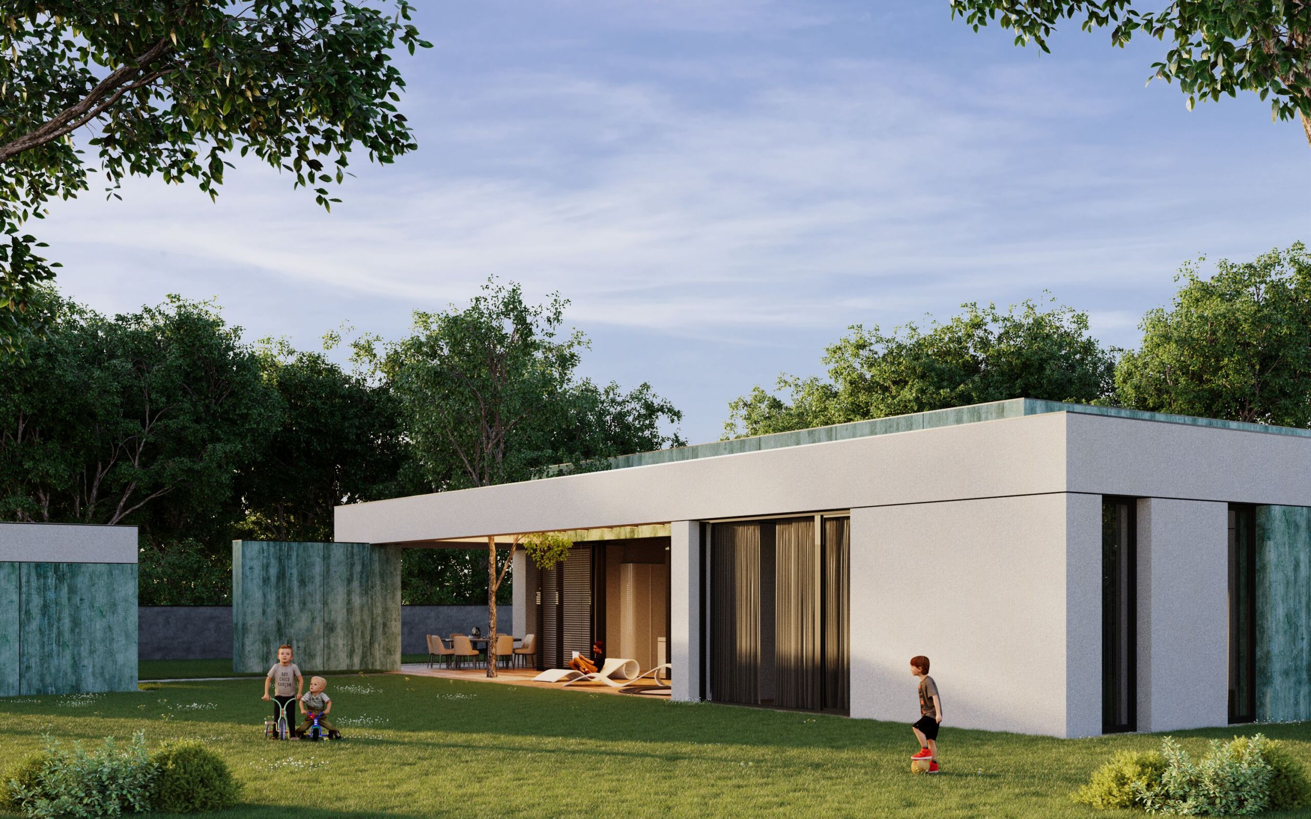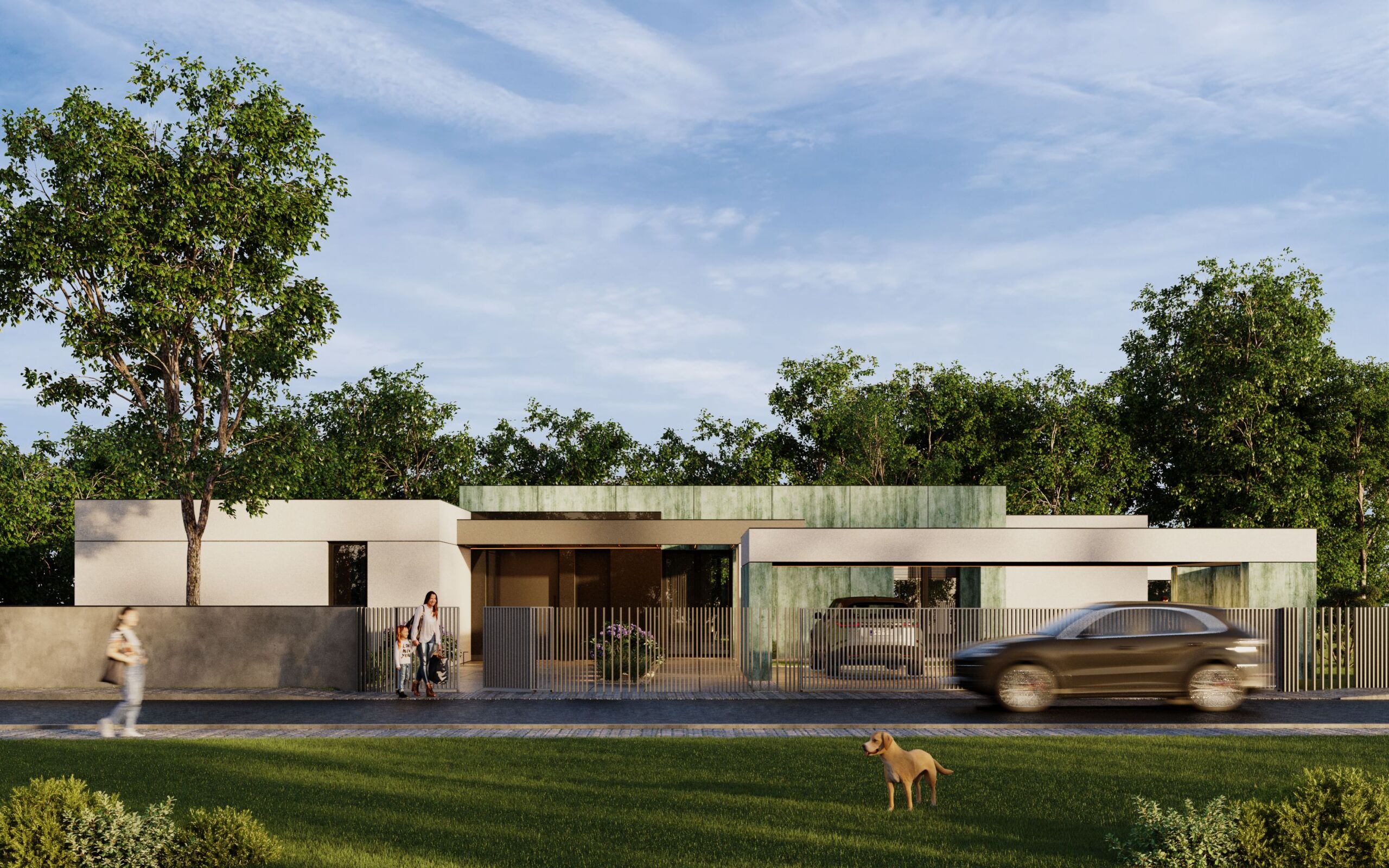 Dom jednorodzinny zaprojektowano jako parterowy, z elewacją łączącą patynowy corten i biały tynk. Od frontu zlokalizowano lekką wiatę na samochody, która tworzy spójną kompozycję z otoczeniem budynku. Wnętrze podzielono na trzy wyraźne strefy: dzienną z podwyższonym sufitem, część przeznaczoną dla dzieci oraz prywatną strefę dla dorosłych. Przestronny salon dzięki dużym przeszkleniom otwiera się na ogród i znajdujący się na działce basen. Całość tworzy funkcjonalny i nowoczesny dom dopasowany do potrzeb mieszkańców.